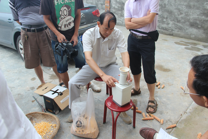 验收组对示范片考察后,先后确定了上、中、下等田块,采取挖样方、称重量、种子水分测定仪测定含水量折算标准亩产的方法进行了现场收获,上等田折合亩产