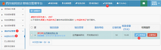 现科技厅将各有关单位应退回的四川省科技计划项目专项资金情况予以通告。请各有关单位见此通告后,联系科技厅相关处室,办理退回财政专项资金事宜,并于4月13日前将退款凭证上传至四川省澳门皇冠线上管理系统(见下图)。